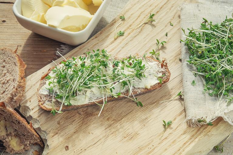 Keywords: cress food green bread bread and butter cress bread wooden board cutting board land love close nutrition bread covering