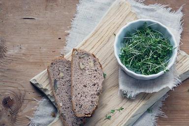 Keywords: cress green natural product bread country bread wooden board cutting board country life close food eat