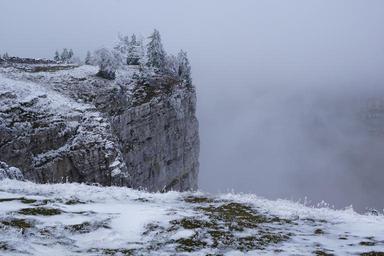 Keywords: creux du van switzerland noiraigue swiss jura stone wall wall mountains jura winter fog white cliffs trees