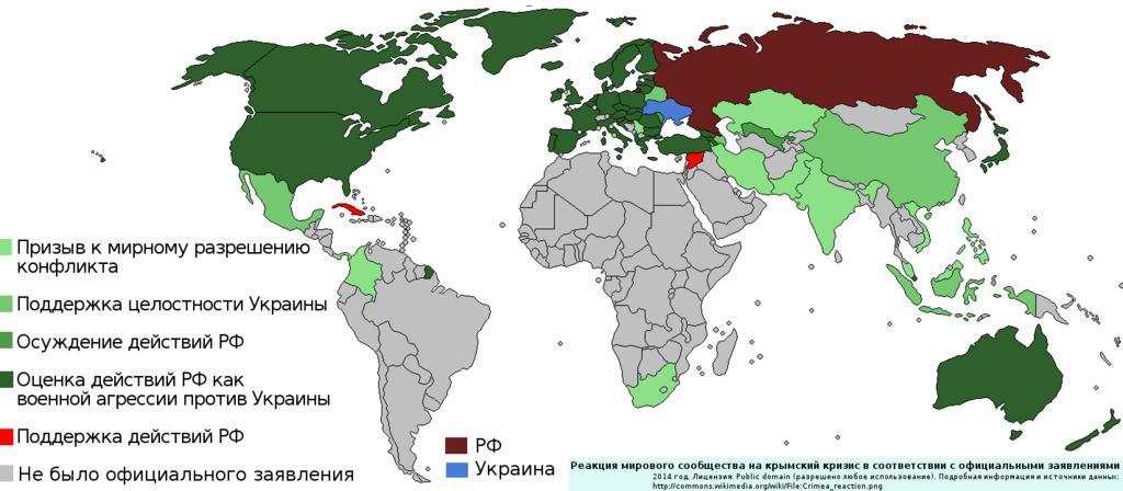 | Keywords: Crimea reaction.png Crimea reaction clean svg здесь Источники <ref>http //www lithuaniatribune com/64476/lithuanian-polish-presidents-call-for-nato-treaty-article-4-consultations-201464476/</ref> <ref>http //www prezydent pl/aktualnosci/wydarzenia/art 2825 rola-polski-wskazywanie-ze-rosja-lamie-prawo-miedzynarodowe html</ref> <ref>http //eeas europa eu/statements/docs/2014/140301_01_en pdf</ref> <ref>http //www nato int/cps/en/natolive/opinions_107663 htm</ref> <ref>http //www nato int/cps/en/natolive/official_texts_107681 htm</ref> <ref>http //www smh com au/federal-politics/political-news/ukraine-tony-abbott-tells-russia-to-back-off-20140302-33tiy html</ref> <ref>http //www theaustralian com au/national-affairs/policy/tony-abbott-condemns-russias-unprovoked-aggression-in-ukraine/story-fn59nm2j-1226843267794</ref> <ref>http //president bg/news1762/announcement-of-the-press-secretariat html lang en</ref> <ref>http //president bg/news1763/announcement-of-the-press-secretariat-of-the-head-of-state html lang en</ref> <ref>http //www international gc ca/media/aff/news-communiques/2014/02/28a aspx lang eng</ref> <ref>http //www whitehouse gov/the-press-office/2014/03/01/readout-president-obama-s-calls-president-hollande-and-prime-minister-ha</ref> <ref>http //www cbc ca/news/world/ukraine-crisis-canada-u-s-tell-russia-to-withdraw-forces-1 2556228</ref> <ref>http //www fmprc gov cn/eng/xwfw/s2510/t1133558 shtml</ref> <ref>http //www dr dk/Nyheder/Indland/2014/03/02/121108 htm</ref> <ref>http //www vm ee/ q en/node/19307</ref> <ref>http //www suomenmaa fi/uutiset/tuomioja_ven C3 A4j C3 A4_toteuttaa_krimin_sotilaallista_haltuunottoa_6804086 html</ref> <ref>http //www ukrinform ua/ukr/news/frantsiya_vislovila_svoyu_sturbovanist_zagostrennyam_situatsiii_v_krimu_1912981</ref> <ref>http //www civil ge/eng/article php id 26995</ref> <ref>http //www spiegel de/politik/deutschland/krim-krise-merkel-wirft-putin-verstoss-gegen-voelkerrecht-vor-a-956514 html</ref> <ref>http //www news va/en/news/pope-angelus-appeal-for-ukraine-and-christian-frat</ref> <ref>http //www kormany hu/en/ministry-of-foreign-affairs/news/ministry-of-foreign-affairs-concerned-about-crimean-situation</ref> <ref>https //www dfa ie/news-and-media/press-releases/press-release-archive/2014/march/tanaiste-russian-federation-ukraine/</ref> <ref>http //www repubblica it/esteri/2014/03/02/news/ucraina_migliaia_di_soldati_russi_in_crimea_domani_timoshenko_al_cremlino-80002998/</ref> <ref>http //www japantoday com/category/politics/view/japan-expresses-concern-over-russias-ukraine-move</ref> <ref>http //www mfa gov lv/en/news/press-releases/2014/february/01-03-02/</ref> <ref>http //tvnz co nz/breakfast-news/pm-ukraine-pike-allegations-and-act-s-3-strikes-video-5855761</ref> <ref>http //www news24 com/SouthAfrica/News/SA-calls-for-peace-in-Ukraine-20140302</ref> <ref>http //www turkishweekly net/news/163800/turkey-closely-following-developments-in-crimea html</ref> <ref>http //www whitehouse gov/the-press-office/2014/02/28/statement-president-ukraine</ref> <ref>http //24tv ua/home/showSingleNews do sovet_es_trebuet_ot_rossii_nemedlenno_vivesti_voyska_iz_ukraini objectId 416316 lang ru</ref> <ref>http //armenianow com/news/52415/armenia_free_democrats_party_ukraine_statement</ref> <ref>http //www independent com mt/articles/2014-03-03/news/malta-condemns-recent-developments-in-crimea-4134895616/</ref> <ref>http //www president md/eng/comunicate-de-presa/pozitia-republicii-moldova-fata-de-situatia-din-ucraina</ref><ref>http //www sta si/vest php id 1985289 s s</ref> <ref>http //www iarex ru/articles/45744 html</ref> <ref>http //www rappler com/nation/52114-philippines-ukraine-dfa-possible-evacuation</ref> <ref>http //www mofa gov vn/en/tt_baochi/pbnfn/ns140306110607</ref> <ref>http //www cancilleria gov co/newsroom/news/comunicado-del-ministerio-relaciones-exteriores-sobre-la-situacion-ucrania</ref> <ref>http //www laestrella com pa/online/noticias/2014/03/03/ucrania-rusia-crimea-canciller-panameno-201903 asp</ref> <ref>http //russian irib ir/news/iran1/item/200300-q-q</ref> <ref>http //www mofa gov vn/en/tt_baochi/pbnfn/ns140306110607</ref> <ref>http //www cancilleria gov co/newsroom/news/comunicado-del-ministerio-relaciones-exteriores-sobre-la-situacion-ucrania</ref> <ref>http //www timesofisrael com/breaking-silence-israel-urges-diplomacy-in-ukraine/</ref> <ref>http //timesofindia indiatimes com/india/Russian-interests-in-Crimea-legitimate-India/articleshow/31557852 cms</ref> <ref>http //www nation com pk/national/06-Mar-2014/pakistan-urges-peaceful-end-to-ukraine-crisis</ref> <ref>http //www globaltimes cn/content/846829 shtml Uxlz_bFYWSo</ref> <ref>http //www kln gov my/web/guest/home p_p_id 101_INSTANCE_Yt06 p_p_lifecycle 0 p_p_state normal p_p_mode view p_p_col_id column-3 p_p_col_pos 1 p_p_col_count 5 _101_INSTANCE_Yt06_struts_action 2Fasset_publisher 2Fview_content _101_INSTANCE_Yt06_urlTitle press-statement-by-minister-of-foreign-affairs-on-developments-in-ukraine-5-march-2014-kenyataan-akhbar 3A-perkembangan-di-ukraine-5-mac-2014 _101_INSTANCE_Yt06_type content redirect 2Fweb 2Fguest 2Fhome</ref> <ref>http //www sre gob mx/en/index php/archived-press-releases/2382-mexico-expresses-its-deep-concern-at-the-deteriorating-situation-in-ukraine</ref> <ref>http //inserbia info/news/2014/03/serbian-mfa-advises-citizens-to-avoid-trips-to-ukraine/</ref> <ref>http //vz ru/news/2014/3/18/677684 html</ref> en World reaction on the 2014 Crimea crisis Brown - Russia Blue - Ukraine salad green - for peaceful solution of the conflict Light green - support of the Ukraine territorial integrity Green - condemnation of the Russian actions Dark green - interpretation of the Russian actions as a military intervention Red - support of the Russian actions 2014-03-03 18 22 50 own Zhitelew References reflist cc-zero Uploaded with UploadWizard Maps of the international reaction to the Annexation of Crimea by the Russian Federation Imag