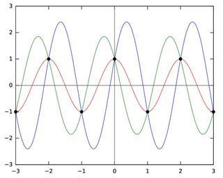 | Keywords: CriticalFrequencyAliasing.svg en Plot of some sinusoids with the critical frequency one half cycle per sample all having samples alternating between +1 and -1 at integer values of t/T Created from scratch with gnuplot based on idea from original bitmap version Qef 2008-07-01 Original low resolution bitmap version http //en wikipedia org/wiki/Image CriticalFrequencyAliasing png Alternative higher resolution bitmap version http //commons wikimedia org/wiki/Image CriticalFrequencyAliasing png Created with Gnuplot set terminal svg font Bitstream Vera Sans set output CriticalFrequencyAliasing svg set xrange -3 3 set yrange -3 3 set xzeroaxis linetype -1 linewidth 0 5 set yzeroaxis linetype -1 linewidth 0 5 set key off set samples 300 plot f x 1/cos a cos pi x+a \ a 0 f x \ a 1 f x \ a 2 f x plot CriticalFrequencyAliasing points \ with points pointtype 7 linetype rgbcolor black The 'CriticalFrequencyAliasing points' file contains the following Created with Gnuplot -3 -1 -2 1 -1 -1 0 1 1 -1 2 1 3 -1 Finally after running Gnuplot I post-processed the image with 'sed' to tweak the axis labels changing hyphens to real minus signs <pre>sed 's/<text>-/<text>\xE2\x88\x92/g' <input svg >output svg</pre> Signal processing Nyquist Shannon theorem |