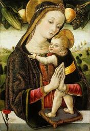 | Keywords: Crivelli Madonna and Child with a clove.jpg Artwork Creator Vittorio Crivelli 4quarter other date century 15 tempera gilding wood cm 49 35 3 Institution Wawel Royal Castle accession number 7959 object history ProvenanceEvent bequest Karolina LanckoroĊska credit line This is perhaps Crivelli's only painting known today in which the Child while nestling against His Mother embraces her with His arms The red carnation at the bottom of the composition a symbol of conjugal love and happiness clearly defines the destination of the picture as a man's gift to his fiancee Agnieszka Janczyk 2005 100 finest paintings from the Wawel Royal Castle Collection Wawel Royal Castle p 27 https //www facebook com/165198703495546/photos/a 165577640124319 43560 165198703495546/1529466137068789/ type 3 theater www facebook com PD-old-100 DEFAULTSORT 1475-1500; Madonna and Child with a clove Vittorio Crivelli LanckoroĊski Collection Wawel Castle Italian paintings in the Wawel Castle 15th-century paintings of Madonna and Child Paintings of Madonna and Child in Poland Madonna with carnations or cloves |