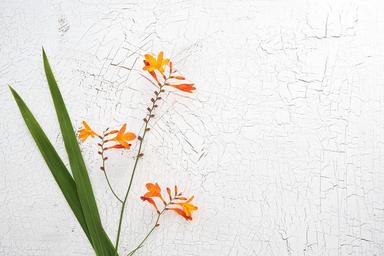Keywords: crocosmia schwertliliengewaechs ornamental plant garden montbretia long stems blossom bloom flower orange late summer orange flowers close texture text freedom copy space