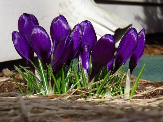 Keywords: crocus flowers purple violet petals blossoms blooms blooming buds flowering plants ornamental decorative colorful nature natural growing gardens gardening green leaves glossy shining shiny floral bright sunny day