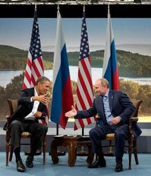 MAKE A MEME View Large Image Cropped Barack Obama and Vladmir Putin shake hands at G8 summit, 2013.jpg en President Barack Obama of the United States and President Vladimir Putin of Russia prepare to shake hands for the cameras following statements to the press at the ...