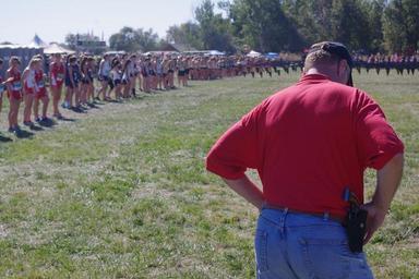Keywords: cross country race start starting line official runners xc athlete running race girls