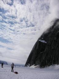 Keywords: cross country skiers snow travel outdoors lifestyle active challenge sky clouds mountains peaks towering ruth gorge denali national park alaska usa adventure recreation trail sport