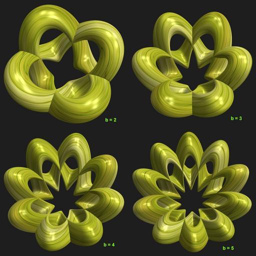 Keywords: mathematica 3d cg parametricplot3d texture torus code program algorithm プログラム コード アルゴリズム 輪環 りんかん ドーナツ どーなつ bamboo 竹 たけ タケ geometric sculpture geometricsculpture shape geometry sculpture mapping テクスチャ マッピング 模様 もよう abstract 抽象 ちゅうしょう アブストラクト design pattern デザイン パターン graphic グラフィック グラフィクス structure 意匠 構造 symmetry 対称性 たいしょうせい シンメトリー 対称 たいしょう black background indoor organic pattern bright a = 3; (* center hole size *) b = 5; (* penta-torus *) c = 0; (* distance from the center of rotation *) d = 2; (* number of torus *) h = 2; (* height of a torus *) SetOptions[ParametricPlot3D, PlotRange -> Full, Mesh -> None, Boxed -> False, Axes -> False, PlotPoints -> 400, ImageSize -> 1600, Background -> RGBColor[{30, 30, 30}/255], PlotStyle -> Directive[Specularity[White, 90], Texture[Import["D:/tmp/71.jpg"]]], TextureCoordinateFunction -> ({#4 + #5, #5 / Pi} &), Lighting -> "Neutral"]; x = (a - Cos[t] - Sin[b s]) Cos[s]; y = (a - Cos[t] - Sin[b s]) Abs[Sin[s]] + c; z = (a - Sin[t] - h Sin[b s]); rm = Table[{x, y, z}.RotationMatrix[2 i Pi/d, {0, 0, 1}], {i, d}]; ParametricPlot3D[rm, {t, 0, 2 Pi}, {s, 0, 2 Pi}] (*--- The Texture *) a = 3; (* center hole size *) b = 5; (* penta-torus *) c = 0; (* distance from the center of rotation *) d = 2; (* number of torus *) h = 2; (* height of a torus *) SetOptions[ParametricPlot3D, PlotRange -> Full, Mesh -> None, Boxed -> False, Axes -> False, PlotPoints -> 400, ImageSize -> 1600, Background -> RGBColor[{30, 30, 30}/255], PlotStyle -> Directive[Specularity[White, 90], Texture[Import["D:/tmp/71.jpg"]]], TextureCoordinateFunction -> ({#4 + #5, #5 / Pi} &), Lighting -> "Neutral"]; x = (a - Cos[t] - Sin[b s]) Cos[s]; y = (a - Cos[t] - Sin[b s]) Abs[Sin[s]] + c; z = (a - Sin[t] - h Sin[b s]); rm = Table[{x, y, z}.RotationMatrix[2 i Pi/d, {0, 0, 1}], {i, d}]; ParametricPlot3D[rm, {t, 0, 2 Pi}, {s, 0, 2 Pi}] (*--- The Texture *) |