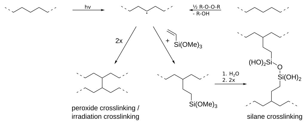 Keywords: Crosslinking PE scheme en.svg en This scheme shows the way to crosslinked polyethylene PE 2016-05-07 own Minihaa other versions cc-zero Polyethylene