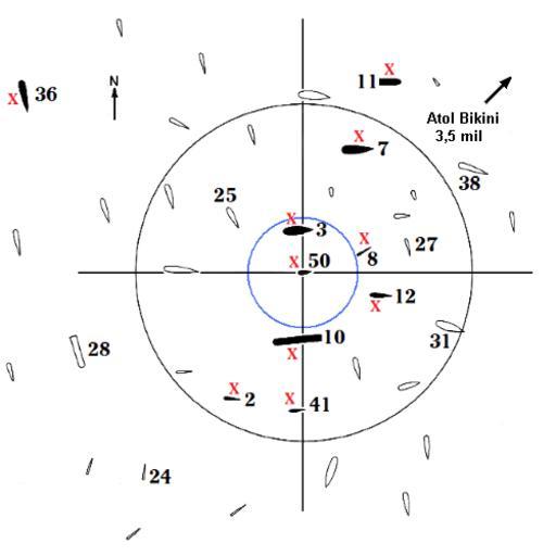 Keywords: Crossroads Baker Target Ship Map (pl).png pl Rozmieszczenie celów na lagunie atolu Bikini dla testu Baker w ramach Operacji Crossroads Połowa jednostek znalazła się poza terenem obrazowanym przez mapę Dziesięć celów oznaczonych czerwonymi iksami zostało zatopionych Tabela po lewej zawiera numerację tych celów Czarny okrąg oznacza odległość 1000 metrów od miejsca eksplozji Zamierzonym centrum był okręt oznakowany jako 50 Niebieski okrąg 330 metrów od celu oznacza krawędź wodnego krateru wytworzonego przez siłę ssącą wybuchu jak również zewnętrzną granicę kolumny wodnej która objęła Arkansas Okręty podwodne były w zanurzeniu USS Pilotfish SS-386 cel 8 na głębokości 19 m a USS Apogon SS-308 cel 2 na głębokości 30 m Opis pochodzi z hasła Operacja Crossroads na pl Wikipedia own HowardMorland mod Farary 2011-06-15 File Crossroads Baker Target Ship Map png modyfikacja pliku na potrzeby pl Wikipedia Cc-zero Crossroads Able |