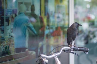 Keywords: crow bicycle shop window people reflection sitting walking sidewalk street town