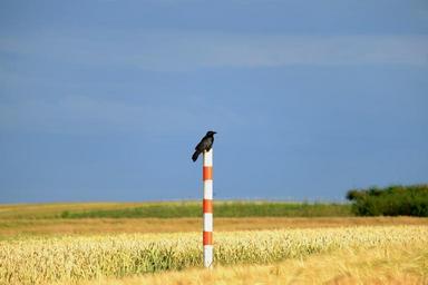 Keywords: crow bird raven bird black animal nature bill fly feather eat sit flight wing pile field cornfield cereals agriculture summer field crops grain landscape arable golden yellow