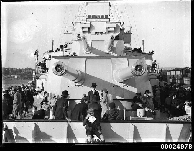 Keywords: samuel j hood collection samueljhoodcollection hood collection hoodcollection hood naval vessel navalvessel navy royal australian navy royalaustraliannavy hmas australia ii hmasaustraliaii australia australian navy australiannavy inspection crowds blackandwhite monochrome photo border black and white This photograph depicts crowds admiring the Royal Australian Navy's cruiser HMAS AUSTRALIA II at wharf 2 in Circular Quay, Sydney. A newspaper article describes the scene: 'Several thousand people visited the cruiser AUSTRALIA at No. 2 wharf, Circular Quay, yesterday afternoon, where she was thrown open for inspection for the first time. The inspections will be continued this afternoon, tomorrow afternoon, and on Sunday, Monday and Tuesday afternoons.' ('H.M.A.S. AUSTRALIA - Inspected by Large Crowds', The Sydney Morning Herald, Friday 26 October 1928, p 14). This photo is part of the Australian National Maritime Museum’s Samuel J. Hood Studio collection. Sam Hood (1872-1953) was a Sydney photographer with a passion for ships. His 60-year career spanned the romantic age of sail and two world wars. The photos in the collection were taken mainly in Sydney and Newcastle during the first half of the 20th century. The ANMM undertakes research and accepts public comments that enhance the information we hold about images in our collection. This record has been updated accordingly. Photographer: Samuel J. Hood Studio Collection Object no. 00024978 This photograph depicts crowds admiring the Royal Australian Navy's cruiser HMAS AUSTRALIA II at wharf 2 in Circular Quay, Sydney. A newspaper article describes the scene: 'Several thousand people visited the cruiser AUSTRALIA at No. 2 wharf, Circular Quay, yesterday afternoon, where she was thrown open for inspection for the first time. The inspections will be continued this afternoon, tomorrow afternoon, and on Sunday, Monday and Tuesday afternoons.' ('H.M.A.S. AUSTRALIA - Inspected by Large Crowds', The Sydney Morning Herald, Friday 26 October 1928, p 14). This photo is part of the Australian National Maritime Museum’s Samuel J. Hood Studio collection. Sam Hood (1872-1953) was a Sydney photographer with a passion for ships. His 60-year career spanned the romantic age of sail and two world wars. The photos in the collection were taken mainly in Sydney and Newcastle during the first half of the 20th century. The ANMM undertakes research and accepts public comments that enhance the information we hold about images in our collection. This record has been updated accordingly. Photographer: Samuel J. Hood Studio Collection Object no. 00024978 |