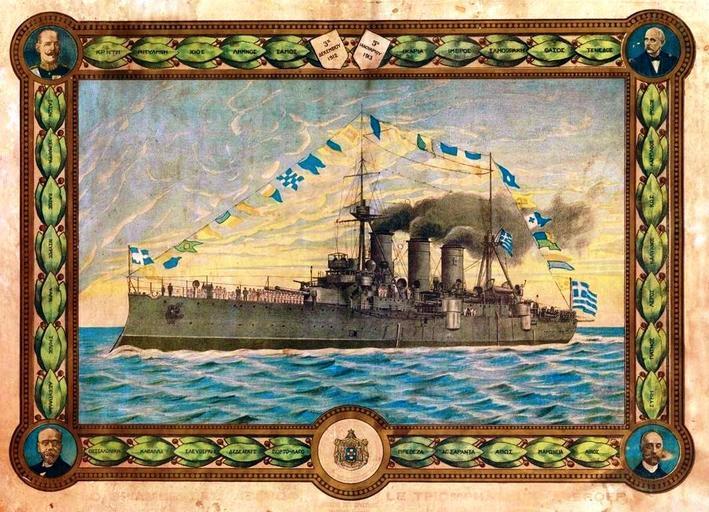 | Keywords: Cruiser Averof lithograph by Christidis.jpg Averof for its role as the Greek fleet's flagship in the Balkan Wars Clockwise from top left are depicted King Constantine I of Greece the businessman Georgios Averoff Admiral Pavlos Kountouriotis and Prime Minister Eleftherios Venizelos The laurels bear the names of the Greek islands and coastal towns taken by the Greek navy and the two shields the dates of the two great naval battles of Elli and Lemnos Θ/Κ ΑΒΕΡΩΦ για τη δράση του στους Βαλκανικούς Πολέμους Δεξιόστροφα α ό άνο αριστερά εικονίζονται ο βασιλιάς Κωνσταντίνος Α' της Ελλάδας ο εθνικός ευεργέτης Γεώργιος Αβέρωφ ο ναύαρχος Παύλος Κουντουριώτης και ο ρωθυ ουργός Ελευθέριος Βενιζέλος Στα φύλλα δάφνης αναγράφονται τα ονόματα νήσων και αραθαλασσίων εριοχών ου α ελευθερώθηκαν α ό τον Ελληνικό Στόλο και στους δυο θυρεούς αναγράφονται οι ημερομηνίες των ναυμαχιών της Έλλης και της Λήμνου 2010-05-10 scanned from original Creator Sotirios Christidis Custom license marker 2012 01 29 PD-old-70 Uploaded with UploadWizard Georgios Averof ship 1910 Lithographs of Greece Pavlos Kountouriotis Constantine I of Greece Eleftherios Venizelos in art Sotirios Christidis |