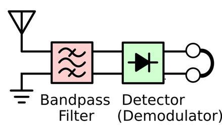 | Keywords: Crystal radio receiver block diagram.svg crystal radio the simplest type of radio receiver which was invented in the early 1900s and widely used until vacuum tube receivers replaced it It consists of an antenna attached to a tuned circuit which functions as a bandpass filter which allows through the frequency of the desired station while rejecting all the other radio signals picked up by the antenna followed by a detector consisting of a semiconductor diode which extracts the audio modulation signal sound from the radio frequency carrier wave The audio is applied to earphones which convert it to sound waves 2016-01-05 own Chetvorno other versions cc-zero Crystal radios Radio receivers Uploaded with UploadWizard |