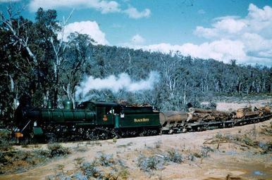| Keywords: Cs270, Banksiadale line, ca. 1960.jpg WAGR C class steam locomotive no Cs270 Eucalyptus patens Black Butt hauling a log train on the Western Australian Government Railways WAGR saw mill line at Banksiadale Western Australia Banksiadale Western Australia http //www railheritagewa org au/archive_scans/displayimage php pid 138 Rail Heritage WA Archive Photo Gallery image T0134 Source claims copyright but image is Public Domain Type of material E in the following table <br> PD-Australia Banksiadale railway line WAGR C class |