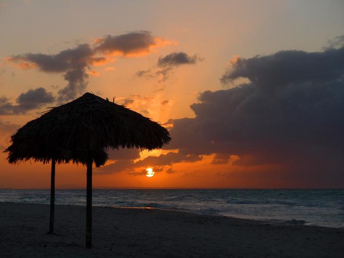 Keywords: cuba beach caribbean atlantic sea ocean sunset clouds sky horizon blue yellow orange sand sand beach screen parasol
