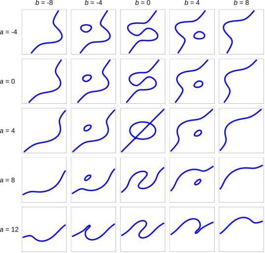 | Keywords: CubicCurve.svg This is a collection of cubic curves the equation with parameters a and b see below Region shown -5 5² екото ые виды кубик у авнение см ниже Показан егион -5 5² <math>4 x 3 - a x 2 y + 9 x y 2 - 9 y 3 - 36 x + 36 y + 10 b \ \ 0</math> Own 2008-02-14 Tos Created with Mathematica <source lang c > GraphicsArray Table ContourPlot 4 x 3 - a x 2 y + 9 x y 2 - 9 y 3 - 36 x + 36 y + 10 b 0 x -5 5 y -5 5 FrameTicks -> None ContourStyle -> Blue Thick a -4 12 4 b -8 8 4 </source> Cubic curves |