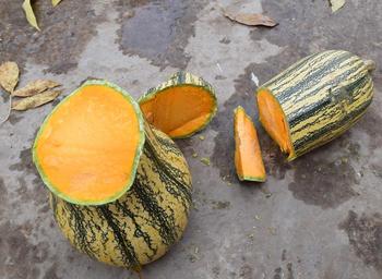 | View Original: | Cucurbita argyrosperma "calabaza rayada o cordobesa" (Florensa) fruto F05 maduro abierto con machete pulpa mesocarpio externo con células piedra piel (epidermis e hipodermis) rasguñada - foco atrás.JPG (3968x2901) | |||