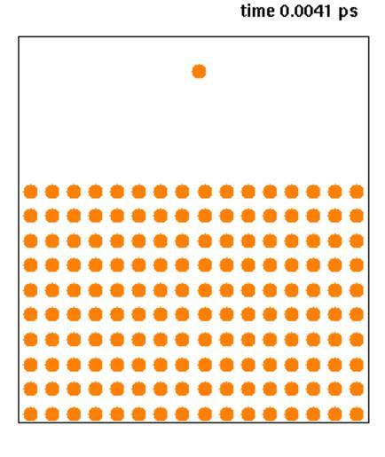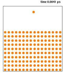 | Keywords: Cudeposition.gif Molecular dynamics computer simulation of the deposition of a single copper atom with a kinetic energy of 1 eV on a copper surface Technical details cross section of two atom layers in the middle of a larger 10x10x10 unit cells 3D simulation cell Simulation made with Sabochick-Lam embedded-atom method potential Berendsen temperature control used only at the outer boundaries to scale temperature down to 0 K Initial temperature 0 K cell prerelaxed to allow for surface relaxation inwards This kind of processes occur in reality during physical vapour deposition Own 2007-07-30 Knordlun Animations of physics Surface science Animated GIF |
