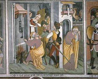| Keywords: Cuisine.medieval.jpg Sanctuaire Notre-Dame des Fontaines La Brigue - nef mur latéral sud registre inférieur - - Cycle de la Passion du Christ Reniement de saint Pierre 10/25 - - Vue d'ensemble - PD-old Second Denial of Saint Peter Chapelle Notre-Dame-des-Fontaines de La Brigue Third Denial of Saint Peter |