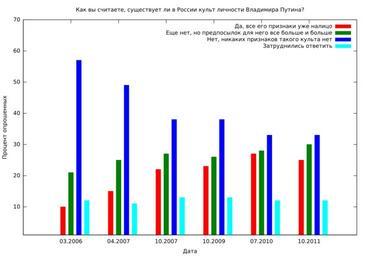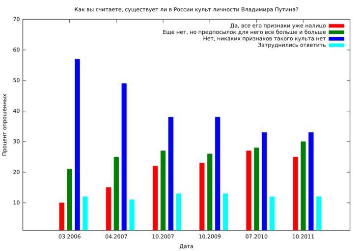 | Keywords: Cult of personality of Putin.svg ru Результаты оп осов Левады о культе личности Владими а Путина Источники http //www levada ru/archive/gosudarstvennye-instituty/premer-ministr/kak-vy-schitaete-sushchestvuet-li-v-rossii-kult-lic http //www levada ru/16-11-2011/o-demokratii-v-rossii-i-kulte-lichnosti-vputina 2013-02-16 16 48 37 own Tsuruya Created with Gnuplot Source code <source lang gnuplot > /usr/bin/gnuplot set term svg size 1000 700 dynamic font sans-serif set datafile separator ; set style data histogram set style fill solid border set style histogram rowstacked set boxwidth 0 6 relative set yrange '1' '70' set title Как вы считаете существует ли в России культ личности Владими а Путина set ylabel П оцент оп ошенных set xlabel 'Дата' set output 'Cult_of_personality_of_Putin svg' set style histogram clustered plot for COL 2 5 'cult txt' using COL xticlabels 1 title columnheader</source> cc-zero Uploaded with UploadWizard Vladimir Putin Sociological diagrams Levada Center |