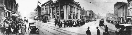 | Keywords: cibc canadian imperial bank of commerce canadianimperialbankofcommerce thunder bay thunderbay port arthur portarthur police crowd automobiles businesses banks cumberland street cumberlandstreet panorama arthur street arthurstreet red river road redriverroad darling & pearson darlingpearson ontario canada history blackandwhite monochrome outdoor black and white Date: 1910s Description: This photograph offers a panoramic view of the corner of South Cumberland Street and Arthur Street (now Red River Road) in the 1910s. The Canadian Imperial Bank of Commerce (CIBC), flanked by a number of businesses, sits in the centre of the photo. The bank was designed by the Toronto based architectural firm of Darling & Pearson (Frank Darling and John A. Pearson) and built in 1905. The people in the photo were invited by the photographer to gather and be part of the picture. Accession No.: 973.68.23 Date: 1910s Description: This photograph offers a panoramic view of the corner of South Cumberland Street and Arthur Street (now Red River Road) in the 1910s. The Canadian Imperial Bank of Commerce (CIBC), flanked by a number of businesses, sits in the centre of the photo. The bank was designed by the Toronto based architectural firm of Darling & Pearson (Frank Darling and John A. Pearson) and built in 1905. The people in the photo were invited by the photographer to gather and be part of the picture. Accession No.: 973.68.23 |
