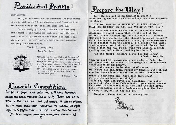 Keywords: cu christian union christianunion newsletter document 1986 akdone sucu text blackandwhite black and white Southampton University Christian Union newsletter from 1986 Southampton University Christian Union newsletter from 1986