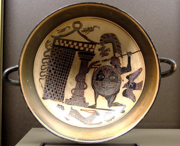 Keywords: Cup Rider Painter Louvre E669 full.jpg Rider Painter Disputed interpretation Achilles watching out for Troilus Louvre notice or Cadmus fighting the Theban dragon C M Stibbe Lakonische Vasenmaler des sechsten Jahrhunderts vor Chr Amsterdam 1972 p 170 Laconian black-figure cup ca 550 BC “540 BC Interprétation disputée Achille guettant Troïlos cartel du Louvre ou Cadmos combattant le dragon de Thèbes C M Stibbe Lakonische Vasenmaler des sechsten Jahrhunderts vor Chr Amsterdam 1972 p 170 Coupe laconienne à figures noires v 550 “540 av J -C H 11 3 cm 4 ¼ in Diam 18 5 cm 7 ¼ in W 24 cm 9 ¼ in Museum Louvre Department of Greek Etruscan and Roman Antiquities Sully first floor room 42 case 1 Stibbe Lakonische Vasenmaler cat no 303 pl 107 object history credit line Campana Collection 1861 accession number E 669 User Bibi Saint-Pol own work 2007-06-06 other versions <gallery> Image Cup Rider Painter Louvre E669 jpg Interior detail </gallery> Ambush of Troilus Achilles in ancient Greek pottery Cadmus in ancient Greek pottery Snakes in ancient Greek pottery Dragons in ancient Greek pottery Kylix interiors Rider Painter Greek antiquities in the Louvre - Room 42 550s BC pottery in France Paris 540s BC pottery in France Paris Vases from the Campana Collection |