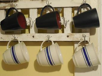Keywords: cups mugs tea coffee drink tea cup home coffee cup white lifestyle wooden rack rustic hanger hanging brown blue yellow kitchen white wood space wood horizontal board
