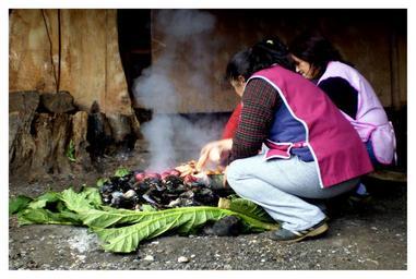 | Keywords: gente 2007 curanto chiloé olympusx760 isla mechuque islamechuque outdoor El curanto (mapudungun: kurantu, 'pedregal' ) es una comida típica de Chile, procedente de Chiloé, y que en la actualidad se ha difundido por el sur de Chile y la Patagonia Argentina. Tradicionalmente se prepara al aire libre, llevando el nombre de "curanto en hoyo", es decir el que está hecho en un pozo cavado en la tierra, aproximadamente de un metro y medio de profundidad. El fondo se cubre con piedras que se calientan en una fogata. Cuando están al rojo vivo se retiran los tizones y se comienza a colocar los ingredientes. La preparación del curanto en hoyo toma bastante tiempo, lo que puede constituir un evento social en si mismo, sobre todo si se tiene en cuenta que el trabajo que demanda hacerlo requiere de la participación de alrededor cinco o más personas. Además del hoyo que previamente se debe haber hecho, está la selección y limpieza de los mariscos que se usarán, además de la fabricación de los productos de papa: el milcao y el chapalele. Después viene todo el armado del curanto y su sellado para permitir una cocción al vapor y con toques de ahumado, que povocan el contacto directo de las piedras al rojo. Una vez listo el curanto este es destapado y los alimentos cocidos se traspasan a fuentes que se van ofreciendo a los comensales. Preparación: Primero se colocan los mariscos (ocasionalmente también distintos tipos de pescado), carne, papas, embutidos o longanizas, chapaleles, milcaos y verduras como habas y arvejas. Las cantidades no son fijas, la idea es que haya un poco de todo. Cada capa de ingredientes se cubre con las grandes hojas de una planta llamada pangue o nalca, o en su defecto, con hojas de parra o de repollo. Todo esto se cubre con tierra, champas y sacos mojados, simulando una gran olla a presión, en la que se cuecen los alimentos durante una hora o un poco más. Se puede preparar también en una olla grande, que se calienta sobre una fogata o parrilla o en una olla a presión. En este caso, el "curanto en olla" recibe el nombre de "pulmay" en la zona central de Chile. Historia: Se postula que esta forma de preparar alimentos era propia del pueblo chono y que con la llegada de los huilliches y de los conquistadores españoles se fueron agregando nuevos ingredientes hasta llegar a ser el curanto que se conoce hoy en día. Sin embargo, hay quienes afirman que el curanto es otra prueba en favor de la teoría que afirma que hubo contacto entre América y Polinesia en la ápoca precolombina, puesto que en Rapa Nui (la Isla de Pascua) se prepara algo semejante, llamado umu. El curanto (mapudungun: kurantu, 'pedregal' ) es una comida típica de Chile, procedente de Chiloé, y que en la actualidad se ha difundido por el sur de Chile y la Patagonia Argentina. Tradicionalmente se prepara al aire libre, llevando el nombre de "curanto en hoyo", es decir el que está hecho en un pozo cavado en la tierra, aproximadamente de un metro y medio de profundidad. El fondo se cubre con piedras que se calientan en una fogata. Cuando están al rojo vivo se retiran los tizones y se comienza a colocar los ingredientes. La preparación del curanto en hoyo toma bastante tiempo, lo que puede constituir un evento social en si mismo, sobre todo si se tiene en cuenta que el trabajo que demanda hacerlo requiere de la participación de alrededor cinco o más personas. Además del hoyo que previamente se debe haber hecho, está la selección y limpieza de los mariscos que se usarán, además de la fabricación de los productos de papa: el milcao y el chapalele. Después viene todo el armado del curanto y su sellado para permitir una cocción al vapor y con toques de ahumado, que povocan el contacto directo de las piedras al rojo. Una vez listo el curanto este es destapado y los alimentos cocidos se traspasan a fuentes que se van ofreciendo a los comensales. Preparación: Primero se colocan los mariscos (ocasionalmente también distintos tipos de pescado), carne, papas, embutidos o longanizas, chapaleles, milcaos y verduras como habas y arvejas. Las cantidades no son fijas, la idea es que haya un poco de todo. Cada capa de ingredientes se cubre con las grandes hojas de una planta llamada pangue o nalca, o en su defecto, con hojas de parra o de repollo. Todo esto se cubre con tierra, champas y sacos mojados, simulando una gran olla a presión, en la que se cuecen los alimentos durante una hora o un poco más. Se puede preparar también en una olla grande, que se calienta sobre una fogata o parrilla o en una olla a presión. En este caso, el "curanto en olla" recibe el nombre de "pulmay" en la zona central de Chile. Historia: Se postula que esta forma de preparar alimentos era propia del pueblo chono y que con la llegada de los huilliches y de los conquistadores españoles se fueron agregando nuevos ingredientes hasta llegar a ser el curanto que se conoce hoy en día. Sin embargo, hay quienes afirman que el curanto es otra prueba en favor de la teoría que afirma que hubo contacto entre América y Polinesia en la ápoca precolombina, puesto que en Rapa Nui (la Isla de Pascua) se prepara algo semejante, llamado umu. El curanto (mapudungun: kurantu, 'pedregal' ) es una comida típica de Chile, procedente de Chiloé, y que en la actualidad se ha difundido por el sur de Chile y la Patagonia Argentina. Tradicionalmente se prepara al aire libre, llevando el nombre de "curanto en hoyo", es decir el que está hecho en un pozo cavado en la tierra, aproximadamente de un metro y medio de profundidad. El fondo se cubre con piedras que se calientan en una fogata. Cuando están al rojo vivo se retiran los tizones y se comienza a colocar los ingredientes.