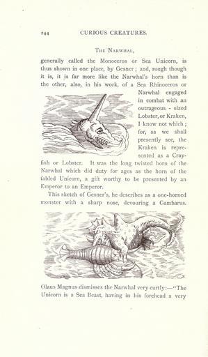 | Keywords: Curious creatures in zoology (14948446333).jpg 244 <br> CURIOUS CREATURES <br> THE NARWHAL <br> generally called the Monoceros or Sea Unicorn is <br> thus shown in one place by Gcsner ; and rough though <br> it is it is far more like the Narwhal's horn than is <br> the other also in his work of a Sea Rhinoceros or <br> Narwhal engaged <br> in combat with an <br> outrageous - sized <br> Lobster or Kraken <br> I know not which ; <br> for as we shall <br> presently see the <br> Kraken is repre- <br> sented as a Cray- <br> fish or Lobster It was the long twisted horn of the <br> Narwhal which did duty for ages as the horn of the <br> fabled Unicorn a gift worthy to be presented by an <br> Emperor to an Emperor <br> This sketch of Gesner's he describes as a one-horned <br> monster with a sharp nose devouring a Gambarus <br> Glaus Magnus dismisses the Narwhal very curtly The <br> Unicorn is a Sea Beast having in his forehead a very 23574999 76213 32031 Page 244 Text http //www biodiversitylibrary org/page/23574999 1890 10 5962/bhl title 32031 Ashton John NameFound Magnus NameFound Monoceros NameConfirmed Monoceros EOLID 4608239 NameBankID 3398650 NameFound Rhinoceros NameConfirmed Rhinoceros EOLID 15581 NameBankID 2478645 Biodiversity Heritage Library Leviathans Curious creatures in zoology; with 130 illus throughout the text Monsters Are Real Animals University of California Libraries archive org bhl page 23574999 dc identifier http //biodiversitylibrary org/page/23574999 bhlMonstersRreal Halloween leviathan university of california libraries archive org bhlmonstersrreal Information field Flickr posted date ISOdate 2014-10-19 CC-BY-2 0 BioDivLibrary https //flickr com/photos/61021753 N02/14948446333 2015-08-25 20 54 32 cc-by-2 0 PD-old-70-1923 leviathan Curious creatures in zoology Photos uploaded from Flickr by Fæ using a script |