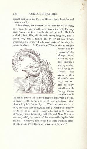 Keywords: Curious creatures in zoology (14947839234).jpg 216 <br> CURIOUS CREATURES <br> weight cast upon the Fore or Hinder-Deck he sinks and <br> drowns a ship <br> Sometimes not content to do hurt by water onely <br> as I said he will cruelly over throw the ship like any <br> small Vessel striking it with his back or tail He hath <br> a thick black Skin all his body over ; long fins like to <br> broad feet and a forked tail 15 or 20 foot broad <br> wherewith he forcibly binds any parts of the ship he <br> twists it about A Trumpet of War is the fit remedy <br> against him by <br> reason of the <br> sharp noise <br> which he can- <br> not endure <br> and by casting <br> out huge great <br> Vessels that <br> hinders this <br> Monster's pas- <br> sage or for <br> him to play <br> y in <br> and Guns with <br> the sound thereof he is more frighted than with a Stone <br> or Iron Bullett ; because this Ball loscth its force being <br> hindered by his Fat or by the Water or wounds but a <br> little his most vast body that hath a Rampart of mighty <br> Fat to defend it Also I must add that on the Coasts <br> of Norway most frequently both Old and New Monsters <br> are seen chiefly by reason of the inscrutable depth of the <br> Waters Moreover in the deep Sea there are many kinds <br> of fishes that are seldome or never seen by Man 23574971 76213 32031 Page 216 Text http //www biodiversitylibrary org/page/23574971 1890 10 5962/bhl title 32031 Ashton John Biodiversity Heritage Library Leviathans Curious creatures in zoology; with 130 illus throughout the text Monsters Are Real Animals University of California Libraries archive org bhl page 23574971 dc identifier http //biodiversitylibrary org/page/23574971 bhlMonstersRreal Halloween leviathan university of california libraries archive org bhlmonstersrreal Information field Flickr posted date ISOdate 2014-10-19 CC-BY-2 0 BioDivLibrary https //flickr com/photos/61021753 N02/14947839234 2015-08-25 20 56 03 cc-by-2 0 PD-old-70-1923 leviathan Curious creatures in zoology Photos uploaded from Flickr by Fæ using a script |