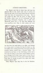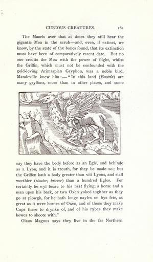 | Keywords: Curious creatures in zoology (14947815314).jpg CURIOUS CREATURES 181 <br> The Maoris aver that at times they still hear the <br> gigantic Moa in the scrub and even if extinct we <br> know by the state of the bones found that its extinction <br> must have been of comparatively recent date But no <br> one credits the Moa with the power of flight whilst <br> the Griffin which must not be confounded with the <br> gold-loving Arimaspian Gryphon was a noble bird <br> Mandeville knew him In this land Bactrid are <br> many gryffons more than in other places and some <br> say they have the body before as an Egle and behinde <br> as a Lyon and it is trouth for they be made so ; but <br> the Griffen hath a body greater than viii Lyons and stall <br> worthier stouter braver than a hundred Egles For <br> certainly he wyl beare to his nest flying a horse and a <br> man upon his back or two Oxen yoked togither as they <br> go at plowgh for he hath longe nayles on hys fete as <br> great as it were homes of Oxen and of those they make <br> Cups there to drynke of and of his rybes they make <br> bowes to shoote with <br> Olaus Magnus says they live in the far Northern 23574936 76213 32031 Page 181 Text http //www biodiversitylibrary org/page/23574936 1890 10 5962/bhl title 32031 Ashton John NameFound Magnus Biodiversity Heritage Library Curious creatures in zoology; with 130 illus throughout the text Monsters Are Real Animals University of California Libraries archive org bhl page 23574936 dc identifier http //biodiversitylibrary org/page/23574936 bhlMonstersRreal Halloween university of california libraries archive org bhlmonstersrreal Information field Flickr posted date ISOdate 2014-10-19 CC-BY-2 0 BioDivLibrary https //flickr com/photos/61021753 N02/14947815314 2015-08-25 21 56 26 cc-by-2 0 PD-old-70-1923 Curious creatures in zoology Photos uploaded from Flickr by Fæ using a script |