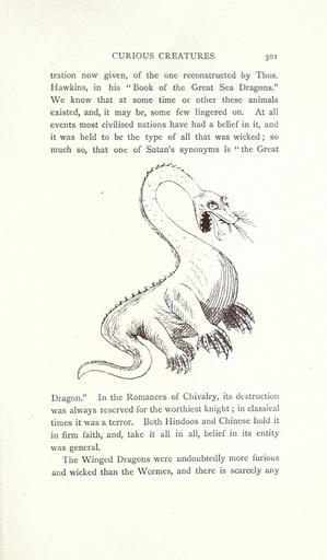 | Keywords: Curious creatures in zoology (15568654645).jpg CURIOUS CREATURES 301 <br> tration now given of the one reconstructed by Thos <br> Hawkins in his Book of the Great Sea Dragons <br> We know that at some time or other these animals <br> existed and it may be some few lingered on At all <br> events most civilised nations have had a belief in it and <br> it was held to be the type of all that was wicked ; so <br> much so that one of Satan's synonyms is the Great <br> Dragon In the Romances of Chivalry its destruction <br> was always reserved for the worthiest knight ; in classical <br> times it was a terror Both Hindoos and Chinese hold it <br> in firm faith and take it all in all belief in its entity <br> was general <br> The Winged Dragons were undoubtedly more furious <br> and wicked than the Wormes and there is scarcely any 23575056 76213 32031 Page 301 Text http //www biodiversitylibrary org/page/23575056 1890 10 5962/bhl title 32031 Ashton John Biodiversity Heritage Library Curious creatures in zoology; with 130 illus throughout the text Monsters Are Real Animals University of California Libraries archive org bhl page 23575056 dc identifier http //biodiversitylibrary org/page/23575056 bhlMonstersRreal Halloween university of california libraries archive org bhlmonstersrreal Information field Flickr posted date ISOdate 2014-10-19 CC-BY-2 0 BioDivLibrary https //flickr com/photos/61021753 N02/15568654645 2015-08-25 20 53 16 cc-by-2 0 PD-old-70-1923 Curious creatures in zoology Photos uploaded from Flickr by Fæ using a script |
