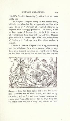 | Keywords: Curious creatures in zoology (15382500728).jpg CURIOUS CREATURES <br> 293 <br> Smith's Classical Dictionary which does not seem <br> unlike one <br> The Wingless Dragons belong to the serpent tribe <br> with the exception that they are generally furnished with <br> legs These are Wormes of several of which we in <br> England were the happy possessors Of course in the <br> northern parts of Europe they survived in story at <br> all events much later than with us and Olaus Magnus <br> gives accounts of several fights with them notably that <br> of Frotho and Fridlevus two Champions against a <br> serpent <br> Frotho a Danish Champion and a King scarce being <br> past his childhood in a single combat killed a huge <br> fierce great Serpent thrusting his sword into his belly <br> for his hard skin would not be wounded and all darts <br> thrown at him flew back again and it was but labour <br> lost Fridlevus was no lesse valiant who both to try <br> his valour and to find out some hidden treasure set <br> upon a most formidable Serpent for his huge body and <br> venomous teeth and for a long time he cast his darts 23575048 76213 32031 Page 293 Text http //www biodiversitylibrary org/page/23575048 1890 10 5962/bhl title 32031 Ashton John NameFound Magnus Biodiversity Heritage Library Curious creatures in zoology; with 130 illus throughout the text Monsters Are Real Animals University of California Libraries archive org bhl page 23575048 dc identifier http //biodiversitylibrary org/page/23575048 bhlMonstersRreal Halloween university of california libraries archive org bhlmonstersrreal Information field Flickr posted date ISOdate 2014-10-19 CC-BY-2 0 BioDivLibrary https //flickr com/photos/61021753 N02/15382500728 2015-08-25 20 53 08 cc-by-2 0 PD-old-70-1923 Curious creatures in zoology Photos uploaded from Flickr by Fæ using a script |