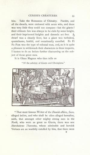 | Keywords: Curious creatures in zoology (14948325823).jpg CURIOUS CREATURES 33 <br> him Take the Romances of Chivalry Pacolet and <br> all the dwarfs were endowed with acute wits and there <br> was very little they could not compass but the giants <br> their ultimate fate was always to be slain by some knight <br> and their imprisoned knights and damsels set free A <br> dwarf was a cleanly liver but a giant was turbulent <br> quarrelsome lustful and occasionally cannibal Fe Fi <br> Fo Fum was the type of colossal man and as it is quite <br> a pleasure to whitewash their characters in these respects <br> I hasten to do so before further discoursing on the sub- <br> ject of these great men <br> It is Olaus Magnus who thus tells us <br> Of the sobriety of Giants and Champions <br> That most famous Writer of the Danish affairs Saxo <br> alleged before and who shall be often alleged hereafter <br> saith that amongst other mighty strong men in the <br> North who were as great as Giants there was one <br> Starchaterus Thavestus whose admirable and heroick <br> Vertues are so worthily extolled by him that there were 23574788 76213 32031 Page 33 Text http //www biodiversitylibrary org/page/23574788 1890 10 5962/bhl title 32031 Ashton John NameFound Magnus Biodiversity Heritage Library Curious creatures in zoology; with 130 illus throughout the text Monsters Are Real Animals University of California Libraries archive org bhl page 23574788 dc identifier http //biodiversitylibrary org/page/23574788 bhlMonstersRreal Halloween university of california libraries archive org bhlmonstersrreal Information field Flickr posted date ISOdate 2014-10-19 CC-BY-2 0 BioDivLibrary https //flickr com/photos/61021753 N02/14948325823 2015-08-25 21 53 25 cc-by-2 0 PD-old-70-1923 Curious creatures in zoology Photos uploaded from Flickr by Fæ using a script |