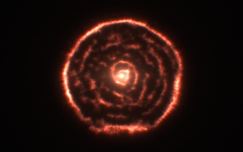Keywords: r sculptoris rsculptoris lunar round circle Observations using the Atacama Large Millimeter/submillimeter Array (ALMA) have revealed an unexpected spiral structure in the material around the old star R Sculptoris. This feature has never been seen before and is probably caused by a hidden companion star orbiting the star. This slice through the new ALMA data reveals the shell around the star, which shows up as the outer circular ring, as well as a very clear spiral structure in the inner material. Observations using the Atacama Large Millimeter/submillimeter Array (ALMA) have revealed an unexpected spiral structure in the material around the old star R Sculptoris. This feature has never been seen before and is probably caused by a hidden companion star orbiting the star. This slice through the new ALMA data reveals the shell around the star, which shows up as the outer circular ring, as well as a very clear spiral structure in the inner material. |