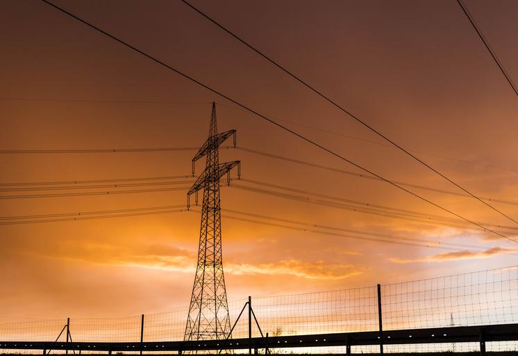 Keywords: current electricity strommast power line pylon high voltage energy atmospheric thunderstorm sunset abendstimmung sky dusk power lines