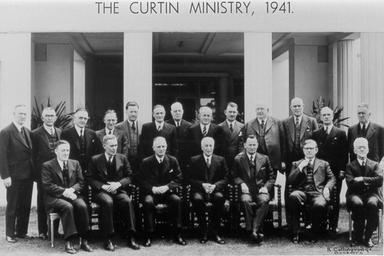 | Keywords: Curtin Ministry 1941.jpg Jack Beasley Minister for Supply and Development Ben Chifley Treasurer John Curtin Prime Minister and Minister for Defence Co-ordination Lord Gowrie Governor-General Frank Forde Minister for the Army H V Evatt Attorney-General and Minister for External Affairs Joe Collings Minister for the Interior Standing Bill Ashley Postmaster-General and Minister for Information Hubert Lazzarini Minister for Home Security Norman Makin Minister for the Navy and Minister for Munitions Arthur Drakeford Minister for the Air and Minister for Civil Aviation Eddie Ward Minister for Labour and National Service George Lawson Minister for Transport Jack Holloway Minister for Health and Minister for Social Services William Scully Minister for Commerce John Dedman Minister for War Organisation of Industry and Minister in charge of the Council for Scientific and Industrial Research Richard Keane Minister for Trade and Customs and Vice-President of the Executive Council Charles Frost Minister for Repatriation and Minister in charge of War Service Homes James Fraser Minister for External Territories Don Cameron Minister for Aircraft Production http //john curtin edu au/diary/primeminister/1941 html Diary of a Labor man Author 1941 PD-Australia PD-ineligible John Curtin Government ministers of Australia Arthur Drakeford Australian politician Ben Chifley Frank Forde Herbert Evatt Jack Beasley Australian politician Alexander Hore-Ruthven 1st Earl of Gowrie Joe Collings Australian politician Eddie Ward Australian politician Hubert Lazzarini Australian politician Bill Ashley New South Wales senator George Lawson Australian politician John Dedman Australian politician Cabinets government ImageNote 1 94 248 36 44 685 457 2 Jack Beasley Minister for Supply and Development ImageNoteEnd 1 ImageNote 2 179 238 36 54 685 457 2 Ben Chifley Treasurer ImageNoteEnd 2 ImageNote 3 270 239 33 52 685 457 2 John Curtin Prime Minister and Minister for Defence Co-ordination ImageNoteEnd 3 ImageNote 4 355 241 32 46 685 457 2 Lord Gowrie Governor-General ImageNoteEnd 4 ImageNote 5 433 235 31 48 685 457 2 Frank Forde Minister for the Army ImageNoteEnd 5 ImageNote 6 536 246 36 46 685 457 2 H V Evatt Attorney-General and Minister for External Affairs ImageNoteEnd 6 ImageNote 7 626 240 36 50 685 457 2 Joe Collings Minister for the Interior ImageNoteEnd 7 ImageNote 8 16 180 39 54 685 457 2 Bill Ashley Postmaster-General and Minister for Information ImageNoteEnd 8 ImageNote 9 72 186 34 48 685 457 2 Hubert Lazzarini Minister for Home Security ImageNoteEnd 9 ImageNote 10 126 188 36 49 685 457 2 Norman Makin Minister for the Navy and Minister for Munitions ImageNoteEnd 10 ImageNote 11 180 193 33 44 685 457 2 Arthur Drakeford Minister for the Air and Minister for Civil Aviation ImageNoteEnd 11 ImageNote 12 218 178 34 45 685 457 2 Eddie Ward Minister for Labour and National Service ImageNoteEnd 12 ImageNote 13 267 181 33 46 685 457 2 George Lawson Minister for Transport ImageNoteEnd 13 ImageNote 14 301 179 31 48 685 457 2 Jack Holloway Minister for Health and Minister for Social Services ImageNoteEnd 14 ImageNote 15 348 184 36 46 685 457 2 William Scully Minister for Commerce ImageNoteEnd 15 ImageNote 16 398 177 32 46 685 457 2 John Dedman Minister for War Organisation of Industry and Minister in charge of the Council for Scientific and Industrial Research ImageNoteEnd 16 ImageNote 17 451 179 35 41 685 457 2 Richard Keane Minister for Trade and Customs and Vice-President of the Executive Council ImageNoteEnd 17 ImageNote 18 514 171 32 46 685 457 2 Charles Frost Minister for Repatriation and Minister in charge of War Service Homes ImageNoteEnd 18 ImageNote 19 567 187 31 43 685 457 2 James Fraser Minister for External Territories ImageNoteEnd 19 ImageNote 20 630 179 36 48 685 457 2 Don Cameron Minister for Aircraft Production ImageNoteEnd 20 |