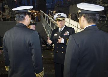 | Keywords: Curtis Wilbur and Kirishima gift exchange 131219-N-TX154-012.jpg  en Cmdr Hans De For commanding officer of the guided-missile destroyer USS Curtis Wilbur DDG 54 greets the commanding officer and executive officer of the Japan Maritime Self-Defense Force guided-missile destroyer JS Kirishima DDG 174 during an annual Christmas gift exchange Curtis Wilbur and Kirishima have been sister ships since 1996 when Curtis Wilbur shifted to Yokosuka and have exchanged gifts every year for the past 17 years U S Navy photo by Mass Communication Specialist 3rd Class Paul Kelly/Released <br>Unit Navy Media Content Services 2013-12-19 Petty Officer 3rd Class Paul Kelly https //www dvidshub net/image/1142739/curtis-wilbur-and-kirishima-gift-exchange 131219-N-TX154-012 2013-12-20 19 37 FLEACT YOKOSUKA JP PD-USGov-Military-Navy USS Curtis Wilbur DDG-54 Images from DoD uploaded by Fæ |