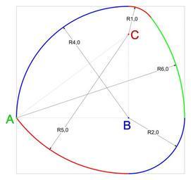 | Keywords: Curve of constant width.svg pl Figura o stałej szerokości równej 6 Punkty A B C są wierzchołkami trójkąta o bokach długości 3 4 i 5 Figura składa się z łuków kół o środku w A i promieniu 6 kolor zielony o środku w punkcie C i promieniach 1 i 5 kolor czerwony oraz o środku w punkcie B i promieniach 2 i 4 kolor niebieski Curve of constant width 6 units The perimeter consists of five circular arcs and one degenerate arc whose centres are the vertices of a 3 4 5 right triangle The green arc of radius 6 and the degenerate arc of radius 0 are drawn around vertex A the blue arcs of radius 2 and 4 around vertex B and the red arcs of radius 1 and 5 around vertex C own on the basis of picture formerly on pl Wiki at http //pl wikipedia org/wiki/Plik Curveofconstantwidth jpg CLI 2010-04-29 For alternative version and details on how this curve would be constructed see File How to make mathematical roller curve based on triangle svg <gallery>File How to make mathematical roller curve based on triangle svg</gallery> Curves of constant width |