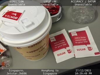 I hope this letter finds you well. I refer to the Photos Attached – Jetstar flight 3K696 – Hong Kong to Singapore – 27 Dec 2015 – 10:29 PM, I wish that the flight crew would add the sugar and creamer for me after asking me how much sugar or creamer I want. It is a safety hazard to uncap the cup filled with hot water in view of hot water spillage onto myself and others due to turbulence or accidents. retail technology transportation signs foodanddrinks |