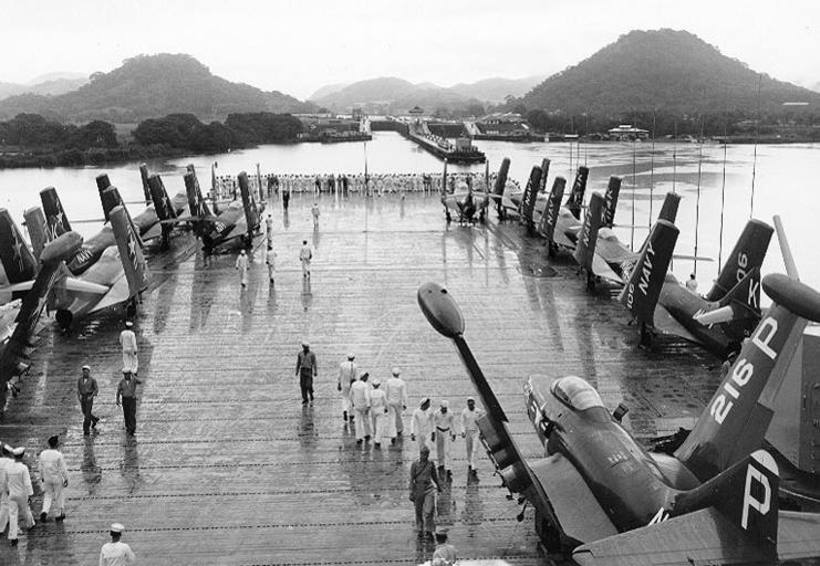 | Keywords: CVG-3 CVA-40 31Aug1954.jpg The U S Navy aircraft carrier USS Tarawa CVA-40 approaches the Pedro Miguel Locks while transiting the Panama Canal on 31 August 1954 The carrier was en route back to the Atlantic in the final stages of her September 1953 - September 1954 World cruise The aircraft visible belong to Carrier Air Group Three CVG-3 The planes parked forward are Grumman F9F-6 Cougar fighters of fighter squadron VF-32 Swordsmen tailcode K In the right foreground a single F9F-5 Panther of VF-102 Roadrunners tailcode P redesignated VA-36 in 1955 is visible Origin Official U S Navy photograph http //www history navy mil/photos/images/h97000/h97600c htm NH 97600 1954-08-31 USN caption removed PD-USGov-Military-Navy Aboard USS Tarawa CV-40 Grumman F9F Cougar Grumman F9F Panther Fighter Squadron 32 United States Navy Attack Squadron 36 United States Navy |