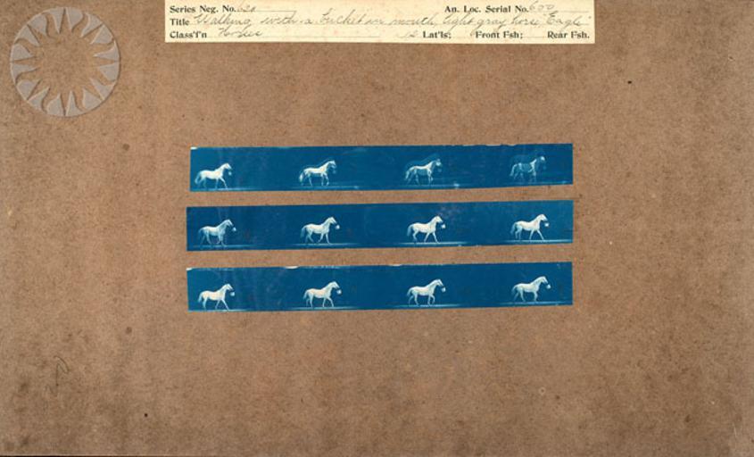 | Keywords: photography physics inventors muybridge smithsonian probably public domain probablypublicdomain SI Neg. 2004-41316. Date: na....Title: "Walking with a bucket in mouth, light gray horse, 'Eagle'.".Series Neg. No. 620.An. Loc. Serial No. 600.Classification: "Horses.".Muybridge's cyanotypes are working proofs, the contact prints he made from more than 20,000 negatives he took at the University of Pennsylvania between 1884 and 1886 while photographing human and animal subjects in motion from lateral (parallel), front and rear positions. Since the original negatives no longer exist, the cyanotypes provide us with the opportunity to see the pictures Muybridge achieved before he edited and cropped them for publication..From the Photographic History Collection, National Museum of American History...Credit: Eadweard Muybridge (Smithsonian Institution) SI Neg. 2004-41316. Date: na....Title: "Walking with a bucket in mouth, light gray horse, 'Eagle'.".Series Neg. No. 620.An. Loc. Serial No. 600.Classification: "Horses.".Muybridge's cyanotypes are working proofs, the contact prints he made from more than 20,000 negatives he took at the University of Pennsylvania between 1884 and 1886 while photographing human and animal subjects in motion from lateral (parallel), front and rear positions. Since the original negatives no longer exist, the cyanotypes provide us with the opportunity to see the pictures Muybridge achieved before he edited and cropped them for publication..From the Photographic History Collection, National Museum of American History...Credit: Eadweard Muybridge (Smithsonian Institution) |