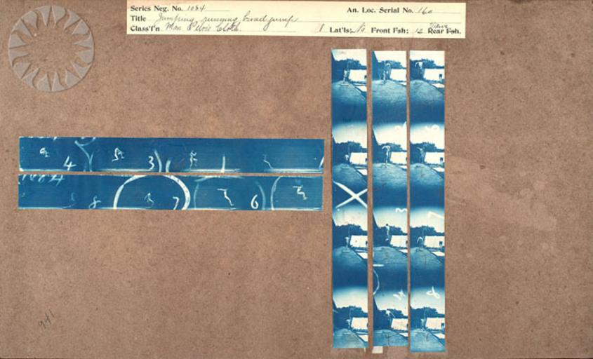 | Keywords: photography physics inventors muybridge smithsonian probably public domain probablypublicdomain SI Neg. 2004-44757. Date: na....Title: "Jumping, running, broad jump.".Series Neg. No. 1084.An. Loc. Serial No. 160.Classification: "Man Pelvis Cloth.".Muybridge's cyanotypes are working proofs, the contact prints he made from more than 20,000 negatives he took at the University of Pennsylvania between 1884 and 1886 while photographing human and animal subjects in motion from lateral (parallel), front and rear positions. Since the original negatives no longer exist, the cyanotypes provide us with the opportunity to see the pictures Muybridge achieved before he edited and cropped them for publication..From the Photographic History Collection, National Museum of American History...Credit: Eadweard Muybridge (Smithsonian Institution) SI Neg. 2004-44757. Date: na....Title: "Jumping, running, broad jump.".Series Neg. No. 1084.An. Loc. Serial No. 160.Classification: "Man Pelvis Cloth.".Muybridge's cyanotypes are working proofs, the contact prints he made from more than 20,000 negatives he took at the University of Pennsylvania between 1884 and 1886 while photographing human and animal subjects in motion from lateral (parallel), front and rear positions. Since the original negatives no longer exist, the cyanotypes provide us with the opportunity to see the pictures Muybridge achieved before he edited and cropped them for publication..From the Photographic History Collection, National Museum of American History...Credit: Eadweard Muybridge (Smithsonian Institution) |