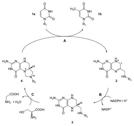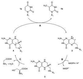 | Keywords: Cycle Synthesis dTMP.svg en Synthesis of dTMP from dUMP using 5 10-Methylenetetrahydrofolate 5 10-Methylenetetrahydrofolate hereby is converted to 7 8-Dihydrofolate which is reduced to Tetrahydrofolic acid and subsequently converted to 5 10-Methylenetetrahydrofolate de Biosynthese von dTMP aus dUMP Bei dieser Reaktion wird N5-H10-Methylen-THF zu 7 8-Dihydrofolat umgesetzt Dieses wird zu THF reduziert und reagiert mit Serin zu N5-H10-Methylen-THF Own Yikrazuul 12 7 08 Nitrogen compounds Pyrimidines Folate Nucleotide metabolism Biosyntheses |