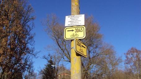 Keywords: Cyklorozcestník a dík.jpg cs Cyklorozcestník u Nových Zákup s děkovací tabulkou od města Zákupy za opravu silnice own Zákupák 2009-11-28 Nové Zákupy Cycling route signs in the Czech Republic