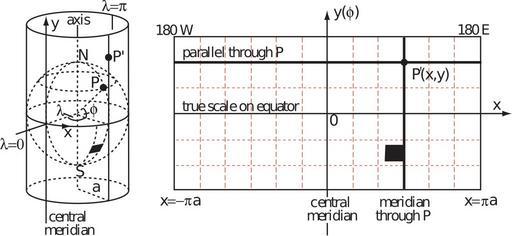 Keywords: Cylindrical Projection basics.svg en The geometry for the normal equatorial tangent projections of the sphere to the cylinder own Peter Mercator Cylindrical projection SVG diagrams in English SVG diagrams
