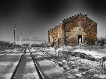 Keywords: czech landscape sky clouds building stone winter snow railway railroad tracks nature outside wind turbines windmills isolated color black and white